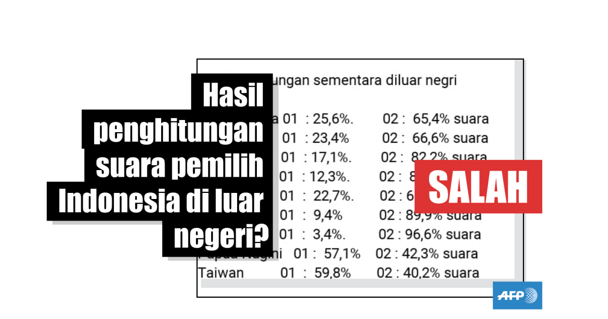 Komisioner KPU Evi Novida Ginting mengatakan ke AFP bahwa klaim hasil pemilu luar negeri seperti terlihat dalam status Facebook tersebut adalah “hoax”.