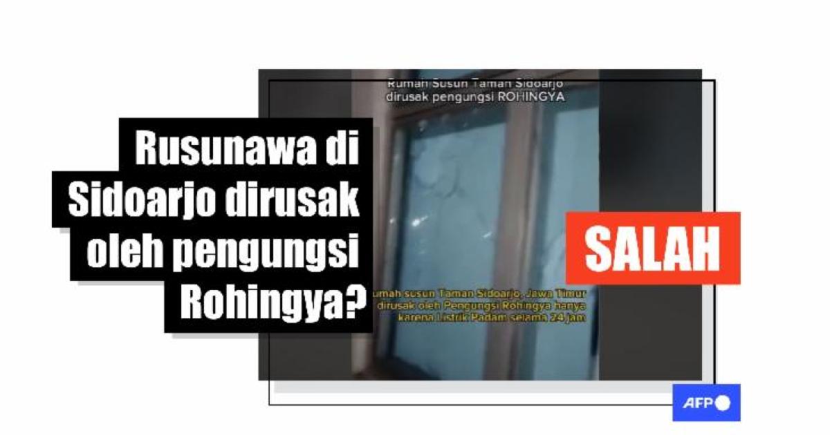 Menurut keterangan di unggahan tersebut, video tersebut "memperlihatkan pengungsi Rohingya diduga merusak fasilitas rumah susun sederhana sewa (Rusunawa) Puspa Agro Jemundo Kecamatan Taman di Sidoarjo, Jawa Timur karena lampu padam selama 24 jam imbas kebakaran gudang PT Lazada pada Jumat, 8 Desember 2023."