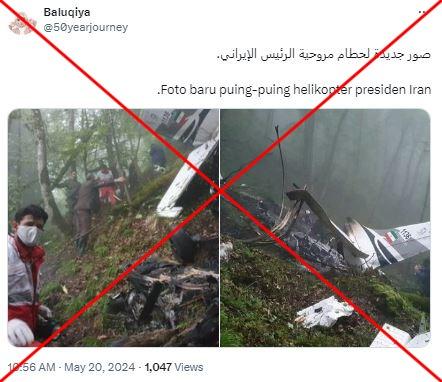 "Foto baru puing-puing helikopter presiden Iran," demikian bunyi keterangan dalam sebuah postingan Twitter yang diunggah pada 20 Mei 2024.