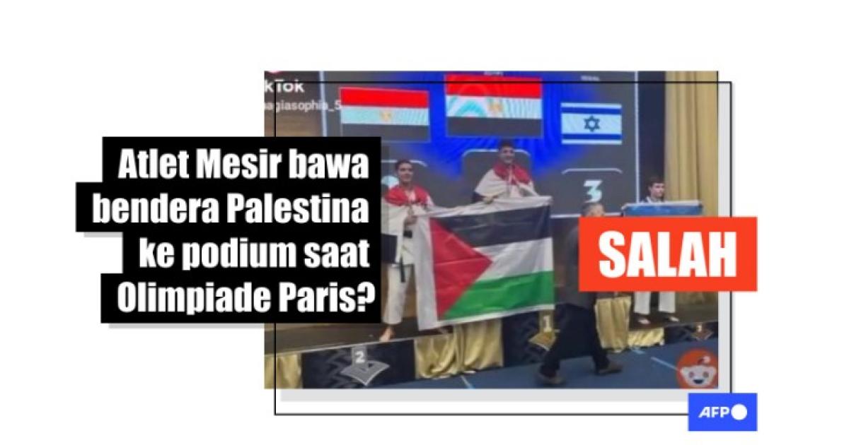 "Dua atlet pemegang sabuk hitam Mesir mengibarkan bendera Palestina setelah mengalahkan lawan asal Israel di Olimpiade Paris," tulis keterangan foto yang diunggah di TikTok pada tanggal 30 Juli 2024.