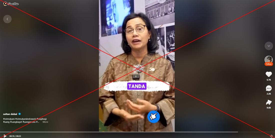 Video dalam postingan tersebut menunjukkan Sri Mulyani mengajak orang untuk "menyukai dan membagikan" unggahan tersebut sebagai syarat untuk mendapatkan bantuan tunai yang diklaim dalam rekaman.
