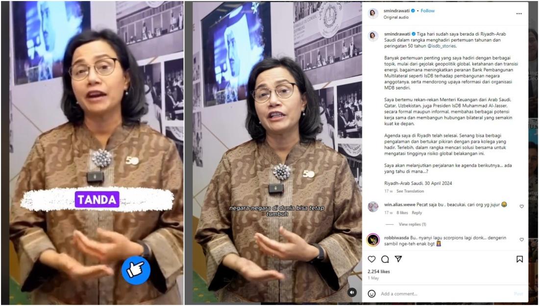 AFP menemukan bahwa klip pertama yang digunakan dalam unggahan palsu tersebut sama dengan video yang dibagikan di akun Instagram resmi Sri Mulyani pada 30 April 2024 (tautan arsip). Unggahan tersebut merangkum kunjungannya ke ibu kota Arab Saudi, Riyadh.