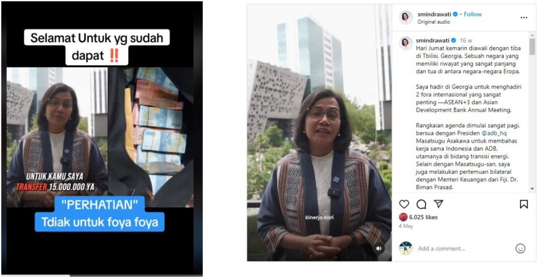 Di bawah ini adalah perbandingan tangkapan layar dari video yang dimanipulasi (kiri) dan unggahan Instagram Sri Mulyani (kanan):