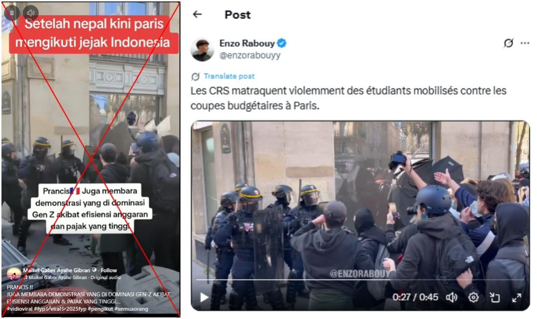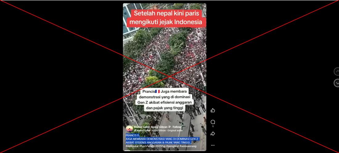 "Setelah Nepal kini Paris mengikuti jejak Indonesia. Prancis juga membara. Demonstrasi yang didominasi gen Z akibat efisiensi anggaran dan pajak yang tinggi," tulis teks yang ditempelkan pada video tertanggal 13 September tersebut.