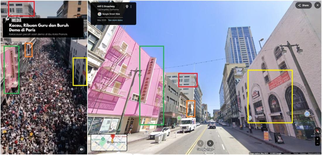 Bangunan-bangunan yang tampak di dalam video di postingan salah sama bentuknya dengan tayangan Google Street View di Jalan Broadway, Los Angeles (tautan arsip).