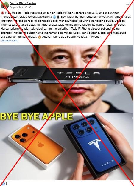 "New Update! Tesla resmi meluncurkan Tesla Pi Phone seharga hanya $789 dengan fitur mengejutkan: gratis koneksi STARLINK! Elon Musk dengan lantang menyatakan, “Apple harus khawatir," tulis postingan Facebook bertanggal 22 September 2025.