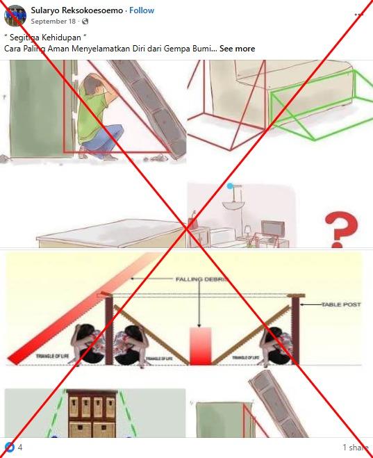 "'Segitiga Kehidupan' Cara Paling Aman Menyelamatkan Diri dari Gempa Bumi," tulis keterangan postingan Facebook yang dibagikan pada tanggal 18 September 2025.