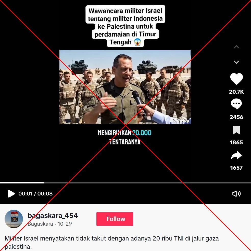 "Wawancara militer Israel tentang militer Indonesia ke Palestina untuk perdamaian di Timur Tengah," tulis takarir video TikTok yang dibagikan pada tanggal 29 Oktober 2025.