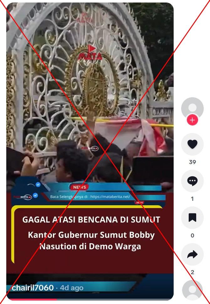 "Gagal atasi bencana di Sumut. Kantor Gubernur Sumut Bobby Nasution didemo warga," tulis keterangan video yang diunggah di TikTok pada tanggal 14 Desember 2025.
