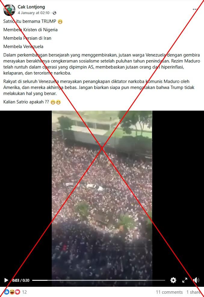 "Rakyat di seluruh Venezuela merayakan penangkapan diktator narkoba komunis Maduro oleh Amerika, dan mereka akhirnya bebas," tulis keterangan video yang dibagikan di Facebook pada tanggal 4 Januari 2026.