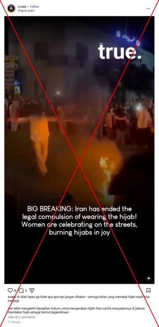 Teks berbahasa Inggris pada video artinya: "Berita besar: Iran telah mengakhiri kewajiban hukum mengenakan hijab! Para perempuan merayakannya di jalan, membakar hijab dengan sukacita."