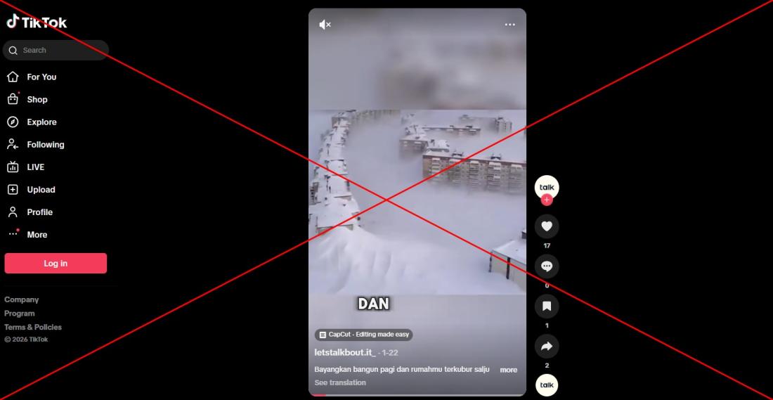 "Bukan editan atau AI! Ini nyata. Terjadi di Kamchatka Russia saat ini. Salju setinggi gedung 5 lantai bikin pemandangan jadi kayak di film kiamat," tulis keterangan video TikTok yang diunggah pada tanggal 20 Januari 2026.