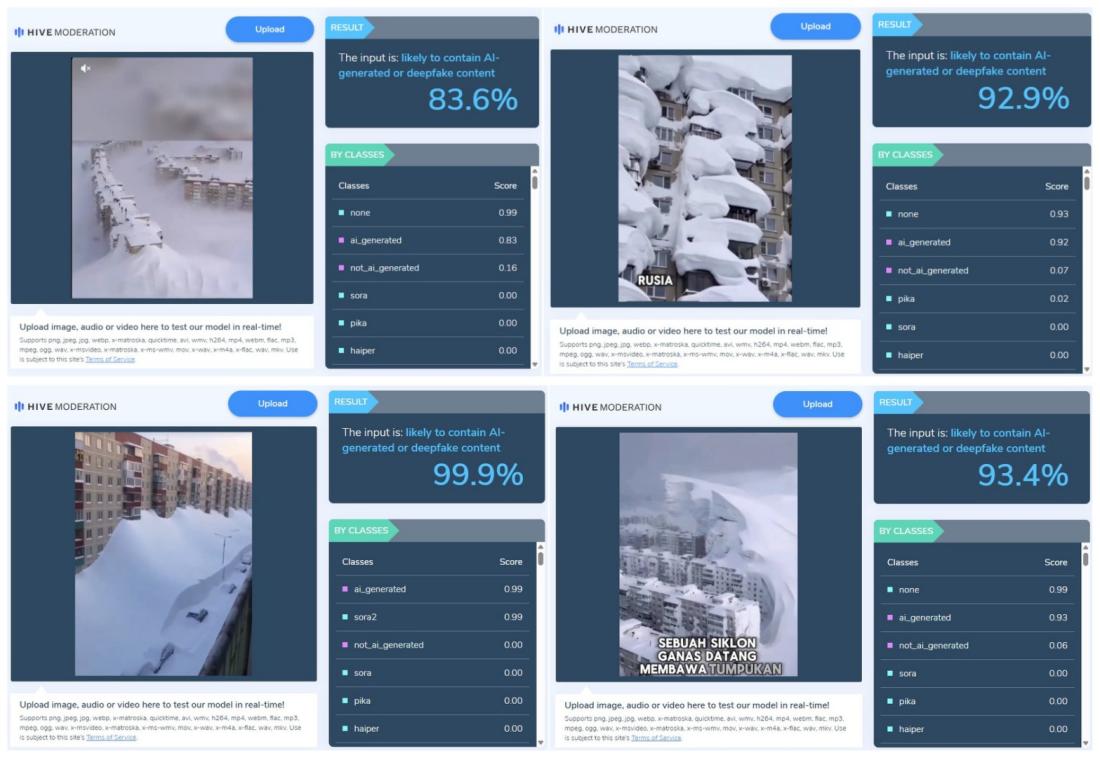 Hasil analisis menggunakan alat deteksi AI bernama Hive Moderation menemukan bahwa keempat potongan klip pada video "kemungkinan mengandung konten buatan AI atau deepfake" (tautan arsip).