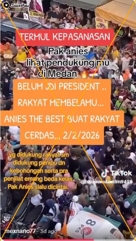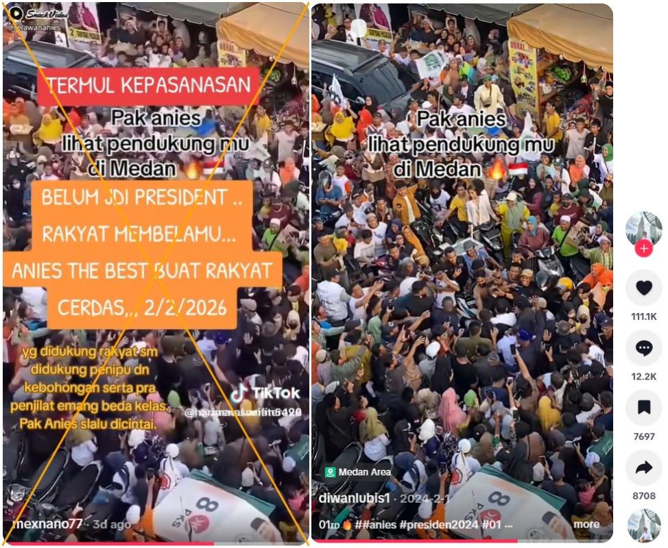 Namun, video yang beredar di media sosial itu tidak memperlihatkan Anies mengunjungi Medan pada Februari 2026 seperti yang diklaim pada postingan tersebut.