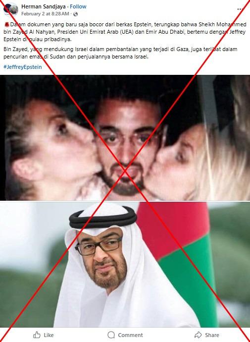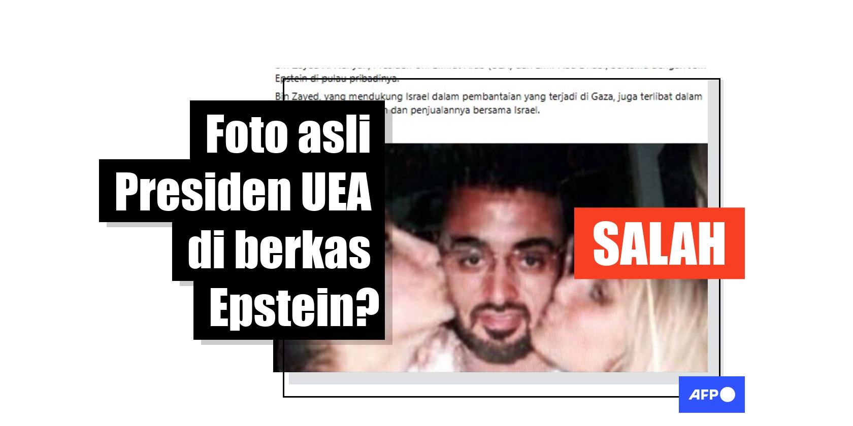 Setelah otoritas Amerika Serikat (AS) merilis jutaan berkas terkait pelaku kejahatan seksual, Jeffrey Epstein, beberapa postingan media sosial membagikan foto yang diklaim secara salah berasal dari "Epstein Files" dan menunjukkan Presiden Uni Emirat Arab (UEA), Mohammed bin Zayed Al Nahyan, dicium oleh dua orang perempuan. Namun, gambar itu hasil manipulasi digital; foto aslinya sudah ada sebelum berkas Epstein dirilis dan menampilkan seorang mantan pemain sepak bola Maroko.