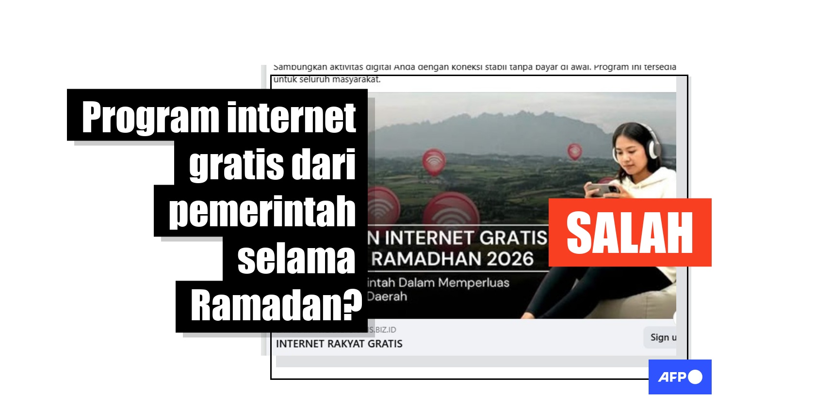 Seiring umat Muslim menjalankan ibadah puasa di bulan suci Ramadan 2026, sejumlah postingan di media sosial membagikan hoaks yang disamarkan sebagai pendaftaran layanan internet gratis dari pemerintah selama bulan puasa. Namun, postingan-postingan ini sebenarnya adalah kedok untuk mendapatkan data pribadi pengguna, dan bukan bagian dari program resmi pemerintah yang menyediakan akses internet untuk masyarakat.