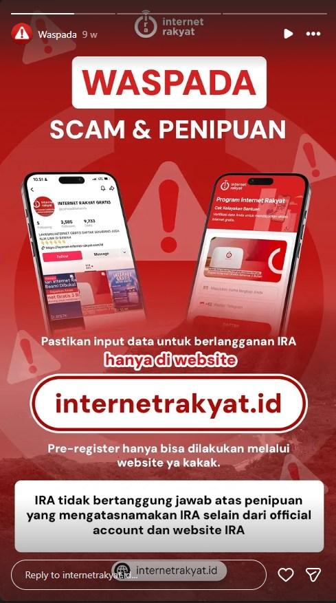 "Pastikan input data untuk berlangganan IRA hanya di website internetrakyat.id," tulis peringatan di akun Internet Rakyat tersebut.