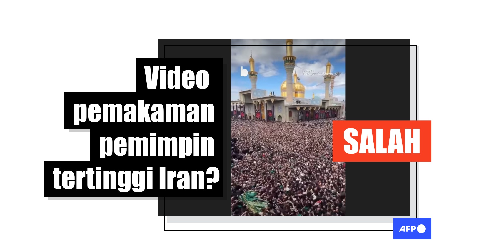 Sebagian rakyat Iran berduka atas terbunuhnya Ayatollah Ali Khamenei dalam serangan gabungan Amerika Serikat (AS) dan Israel pada 28 Februari 2026. Namun, video kerumunan orang di dekat masjid berkubah emas yang beredar di media sosial bukan rekaman saat pemakaman pemimpin tertinggi Republik Islam itu. Video tersebut diambil saat "prosesi pemakaman simbolis" yang diselenggarakan di ibu kota Irak, Baghdad, untuk mengenang wafatnya seorang tokoh Muslim.
