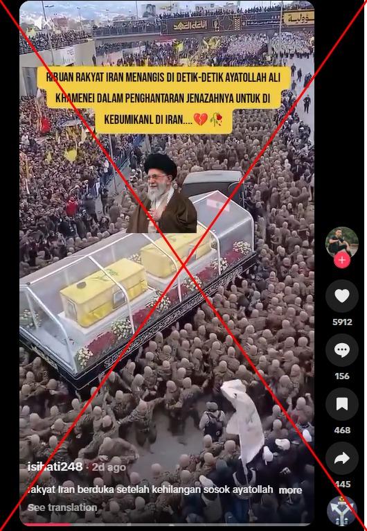 "rakyat Iran berduka setelah kehilangan sosok ayatollah Ali khamenei pimpinan tertinggi di Iran dalam serangan Israel pada tanggal 1 Maret 2026 semalam," tulis keterangan video TikTok yang dibagikan pada 2 Maret 2026.