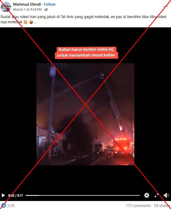 "Rudal atau roket Iran yang jatuh di Tel Aviv yang gagal meledak, ee pas di bersihin tiba-tiba roket nya meledak," tulis postingan Facebook yang dibagikan pada 8 Maret 2026.