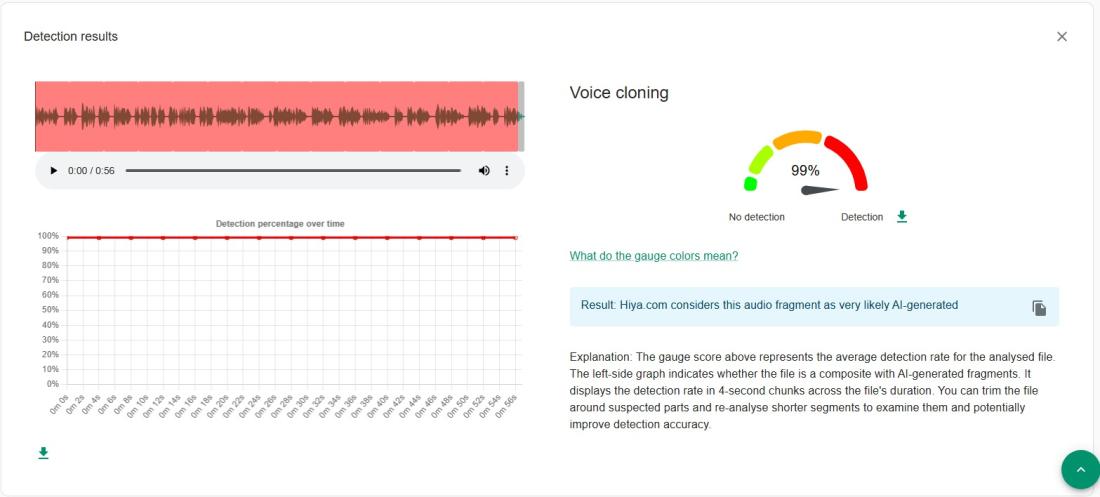 Hasil analisis suara dari video salah tersebut menggunakan alat deteksi tiruan suara, Hiya AI, yang tersedia pada Verification Plugin, atau dikenal juga dengan InVID-WeVerify, menemukan 99 persen kemungkinan bahwa audio itu adalah buatan AI.
