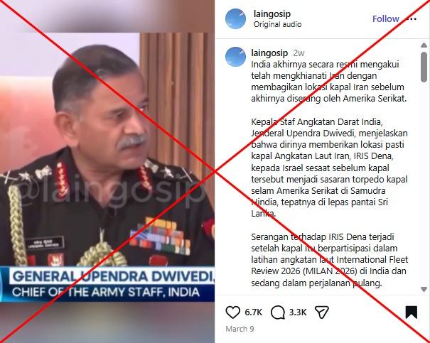 "India akhirnya secara resmi mengakui telah mengkhianati Iran dengan membagikan lokasi kapal Iran sebelum akhirnya diserang oleh Amerika Serikat," tulis sebagian keterangan postingan Instagram pada tanggal 9 Maret 2026. Tayangan video memperlihatkan panglima Angkatan Darat India, Upendra Dwivedi.