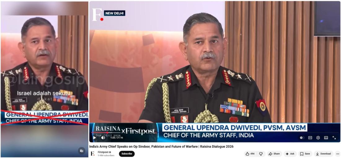 Video Firstpost itu berjudul: "Panglima militer India berbicara soal Op Sindoor, Pakistan, dan Masa Depan Peperangan | Raisina Dialogue 2026."