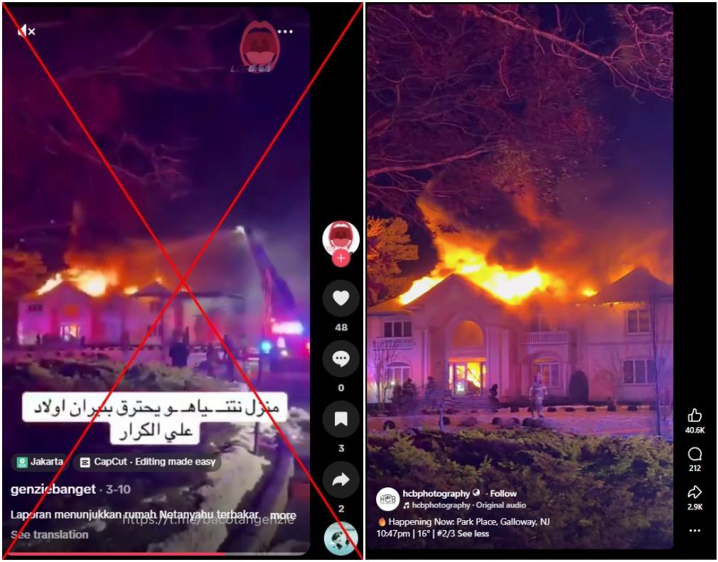 Garda Revolusi Islam Iran (IRGC) mengatakan bahwa pihaknya telah menargetkan kantor Perdana Menteri Israel Benjamin Netanyahu pada 2 Maret. Namun, video yang beredar di media sosial dengan klaim rumah Netanyahu terkena rudal Iran sebenarnya direkam di Amerika Serikat (AS). Video itu memperlihatkan kebakaran rumah di negara bagian New Jersey, AS, yang terjadi sebelum perang antara AS-Israel dengan Iran.