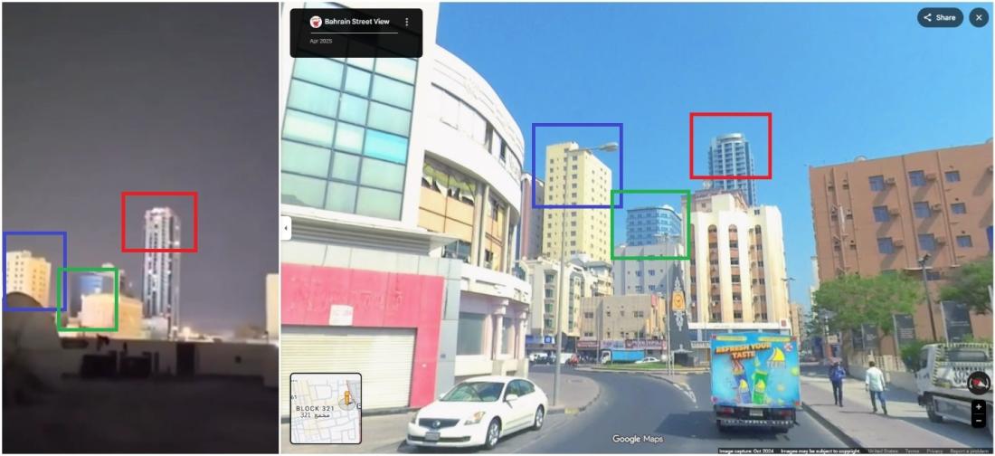 Pencarian kata kunci lebih lanjut menemukan situs resmi milik Era View Tower di Manama, Bahrain (tautan arsip). Bentuk bangunan mereka juga sama dengan gambar pada Google Street View yang menampilkan pemandangan kota Manama (tautan arsip).