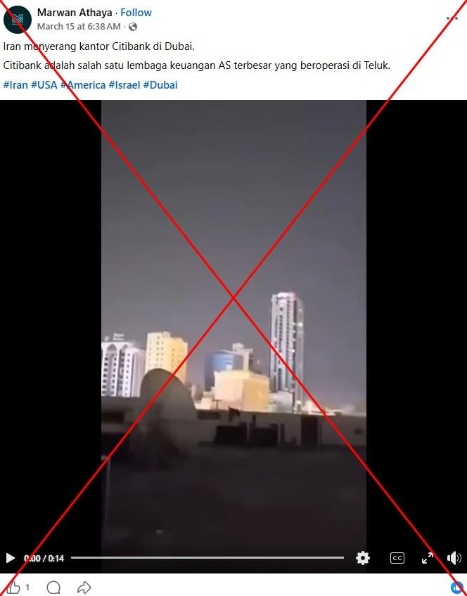 "Iran menyerang kantor Citibank di Dubai. Citibank adalah salah satu lembaga keuangan AS terbesar yang beroperasi di Teluk," tulis keterangan video yang diunggah di Facebook pada pada 15 Maret 2026.
