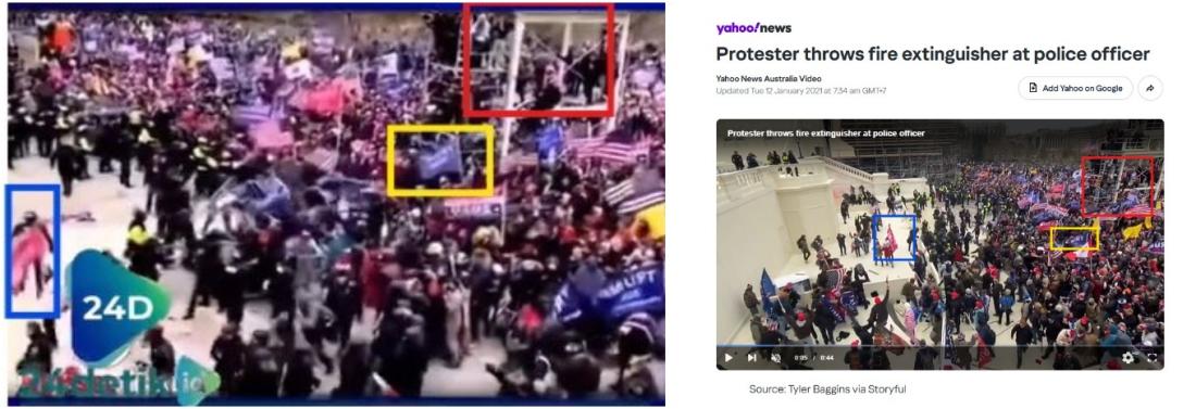 Salah satu foto yang diambil seorang fotografer AFP, Roberto Schmidt, memperlihatkan lokasi yang sama di depan gedung Capitol AS, tepatnya di depan steger yang didirikan untuk pelantikan Biden yang akan datang. Foto AFP tersebut juga menunjukkan polisi mengenakan perlengkapan serupa seperti yang terlihat dalam video salah, serta para perusuh yang mengacungkan bendera dan spanduk yang sama.