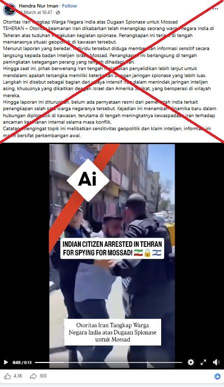 "Otoritas keamanan Iran dikabarkan telah menangkap seorang warga negara India di Teheran atas tuduhan melakukan kegiatan spionase. Penangkapan ini terjadi di tengah memanasnya situasi geopolitik di kawasan tersebut," tulis keterangan video yang diunggah di Facebook pada 11 Maret 2026.