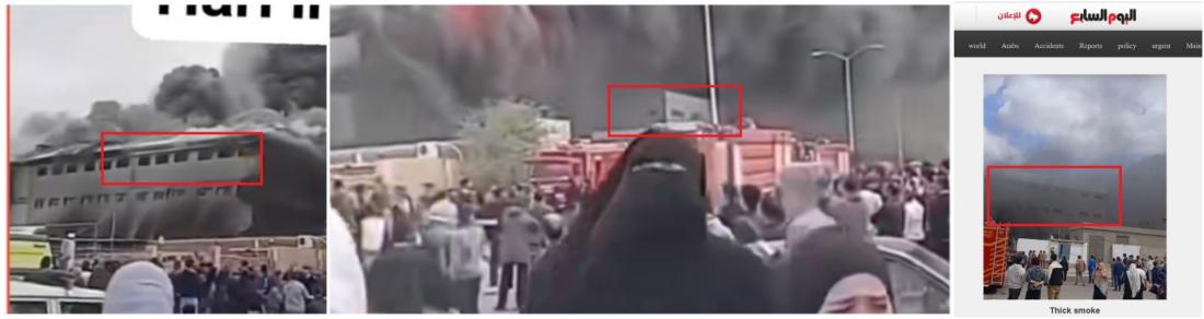 Visual serupa yang menujukkan bangunan dengan kepulan asap dan papan penanda bertuliskan "Future Fashion" juga muncul dalam laporan media Mesir, Youm7, terkait insiden kebakaran pada pabrik tersebut (tautan arsip).