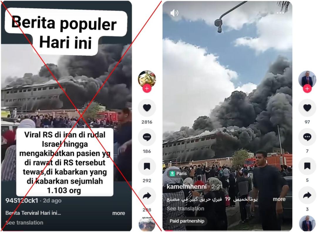 Video kebakaran yang diklaim sebagai serangan terhadap rumah sakit di Iran itu juga beredar di Facebook dan Instagram.