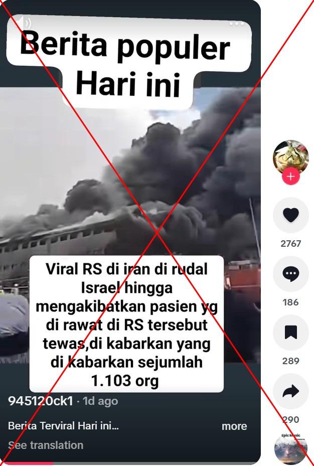 "Viral, RS di Iran di rudal Israel hingga mengakibatkan pasien yang di rawat di RS tersebut tewas, di kabarkan yang di kabarkan sejumlah 1.103 org," tulis teks dalam video TikTok yang dibagikan pada 8 April 2026.