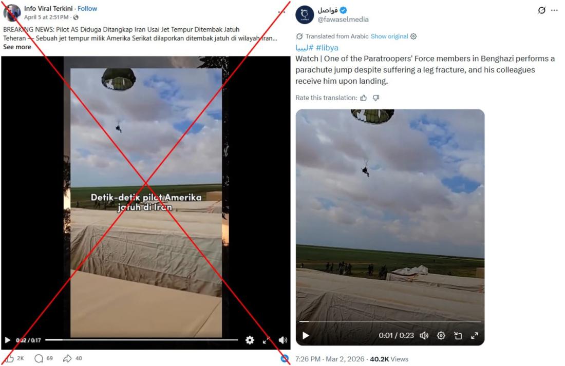 Setelah Iran mengatakan pada April 2026 bahwa pihaknya telah menembak jatuh sebuah jet tempur milik Amerika Serikat (AS), beredar video lama yang diklaim menunjukkan sang pilot jet sedang melakukan pendaratan dengan parasut. Faktanya, klip itu berasal dari latihan terjung payung yang dilakukan militer Libya di bulan Maret.