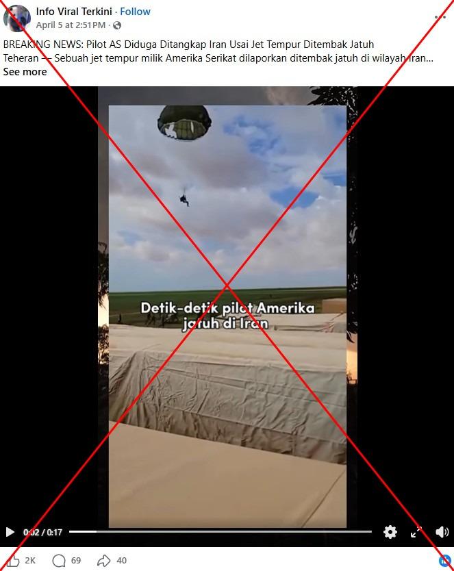 "Detik-detik pilot Amerika jatuh di Iran," tulis teks dalam video yang diunggah di Facebook pada 5 April 2026.