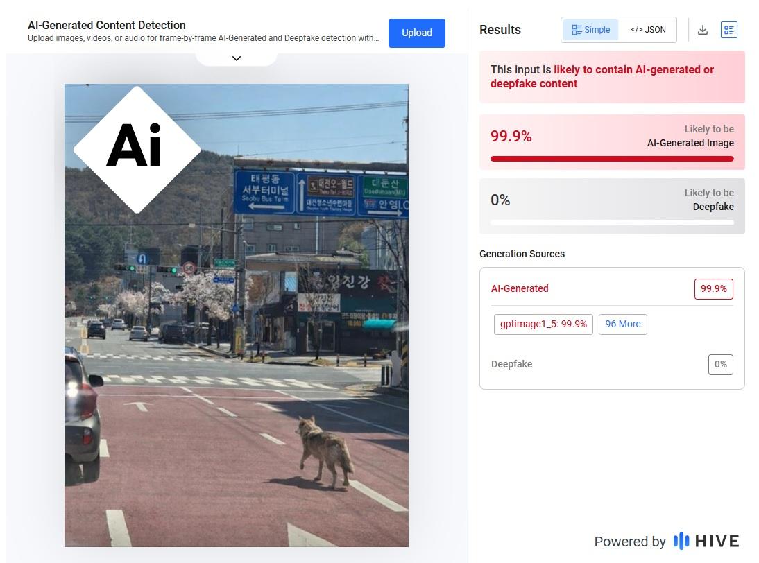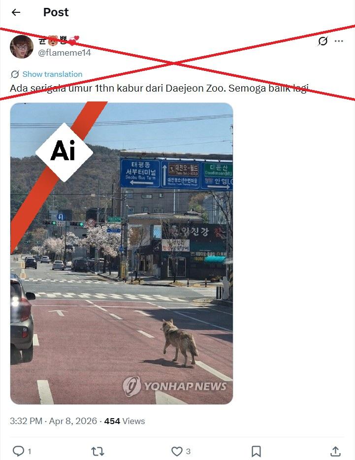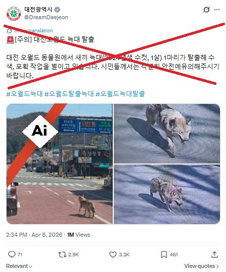 Korea Selatan mengerahkan ratusan petugas serta drone dan juga kamera termal untuk menemukan seekor serigala yang kabur dari sebuah kebun binatang pada 8 April 2026. Beberapa jam setelah insiden itu, beredar sebuah foto yang diklaim menunjukkan serigala tersebut melewati persimpangan jalan di Kota Daejeon. Foto itu bahkan digunakan oleh media lokal dan kantor pemerintah setempat. Namun, analisis visual yang dilakukan oleh AFP mendapati bahwa foto itu dibuat menggunakan teknologi akal imitasi (AI); temuan AFP ini didukung oleh ahli dan pihak berwenang di Negeri Ginseng itu.