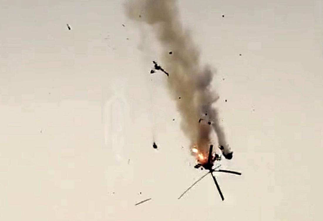 Dalam video tersebut terlihat sebuah helikopter terbakar, meledak dan jatuh.