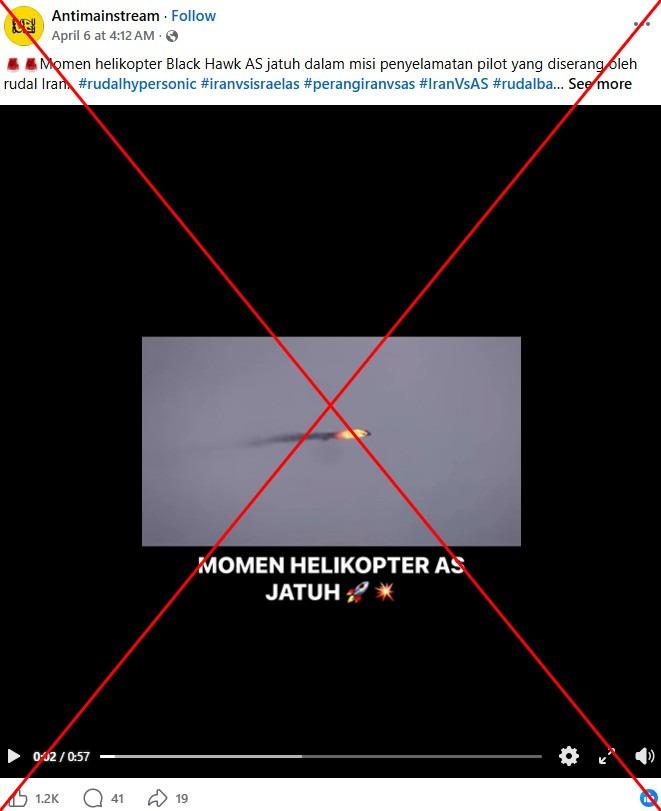 "Momen helikopter AS jatuh," tulis teks pada video Facebook yang diunggah pada 6 April 2026.