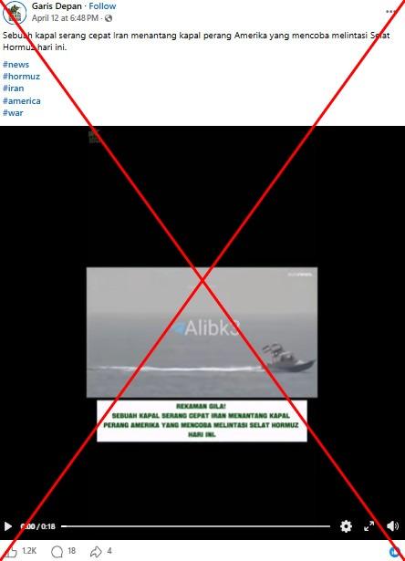 "Rekaman gila! Sebuah kapal serang cepat Iran menantang kapal perang Amerika yang mencoba melintasi Selat Hormuz hari ini," tulis teks pada video yang diunggah di Facebook pada 12 April 2026.