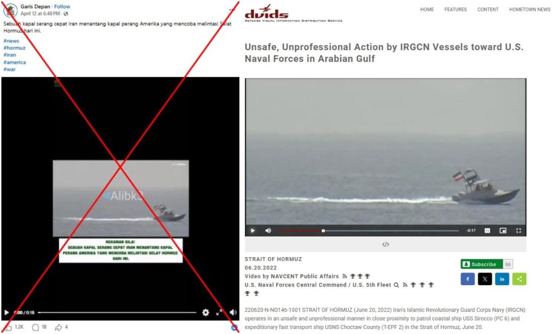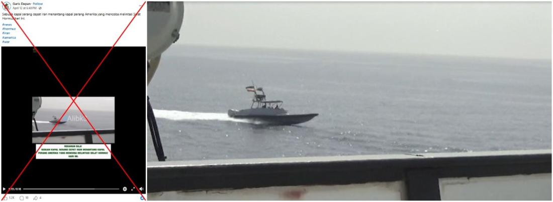 Pada April 2026, Presiden Amerika Serikat (AS) Donald Trump mengancam akan menghancurkan setiap "kapal serang cepat" milik Iran yang mendekati armada Angkatan Laut AS yang melakukan blokade terhadap pelabuhan-pelabuhan Iran. Menyusul pernyataan Trump itu, postingan media sosial membagikan rekaman lama yang diklaim sebagai video terbaru yang menampilkan aksi perahu motor Iran "menantang" kapal perang AS di Selat Hormuz. Padahal, klip itu diambil pada 2022 saat sebuah perahu motor Iran mendekati kapal patroli AS dengan kecepatan tinggi.