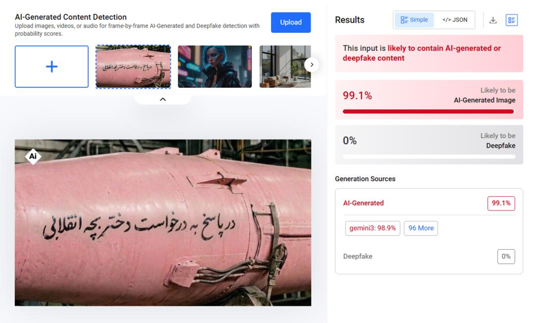 "Struktur spesifik rudal, selubung pelindung, dan berbagai perlengkapannya tidak sesuai dengan rudal Iran mana pun yang saya ketahui," kata Olivier. "Khususnya, bagian kabel yang tidak seperti konektor yang terlihat pada rudal balistik yang telah ada, baik buatan Iran maupun lainnya, dan tampaknya tidak mengikuti jalur yang logis, sebuah kegagalan yang merupakan ciri umum dari gambar yang dihasilkan AI."