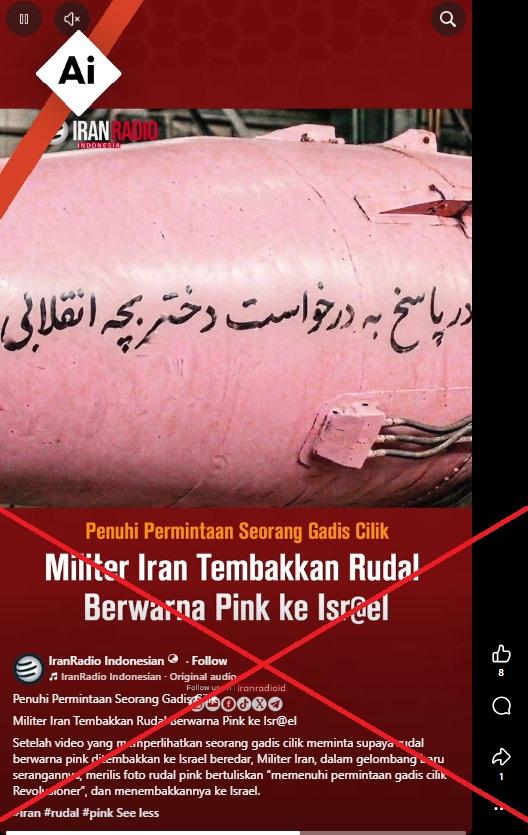 "Militer Iran tembakkan rudal berwarna pink ke Israel setelah video yang memperlihatkan seorang gadis cilik meminta supaya rudal berwarna pink ditembakkan ke Israel beredar," tulis sebagian keterangan postingan.