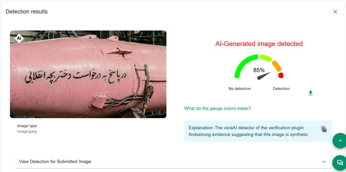 Sedangkan hasil analisis VeraAI pada InVID-WeVerify, yang ikut dikembangkan oleh AFP, menunjukkan angka 85 persen kemungkinan AI.