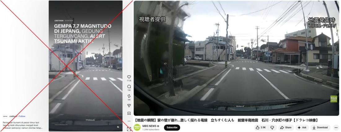Secara terpisah, penelusuran gambar terbalik untuk mencari video kedua -- yang menunjukkan goncangan di sebuah perempatan jalan -- menemukan video sama dengan durasi yang lebih panjang (tautan arsip). Video itu diunggah oleh kantor berita Jepang MBS News di YouTube pada 11 Januari 2024.