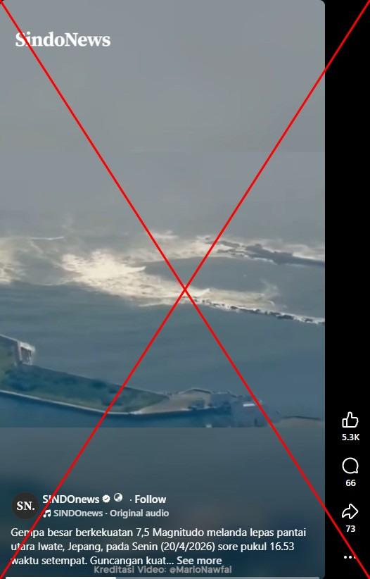 "Gempa besar berkekuatan 7,5 Magnitudo melanda lepas pantai utara Iwate, Jepang, pada Senin (20/4/2026) sore pukul 16.53 waktu setempat. Guncangan kuat terasa hingga Tokyo dan memicu peringatan tsunami setinggi 1 hingga 3 meter untuk wilayah Iwate, Aomori, dan Hokkaido," tulis sebagian keterangan video yang diunggah di Facebook pada 20 April 2026.