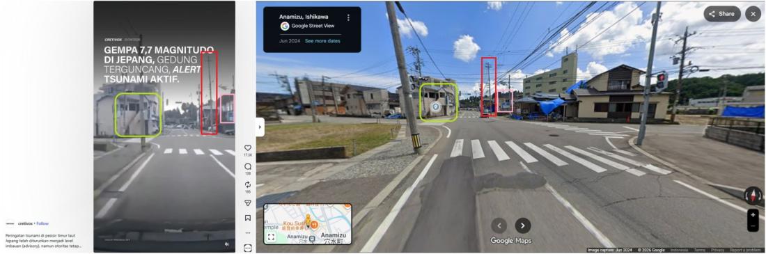 Klip yang beredar itu cocok dengan tampilan Google Street View dari persimpangan di Anamizu, sebuah kota di Prefektur Ishikawa di wilayah pesisir barat Jepang (tautan arsip).