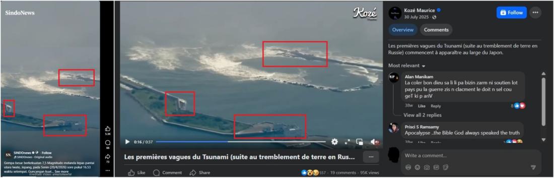 Klip serupa diterbitkan oleh kantor berita Associated Press (AP) di tanggal yang sama (tautan arsip). Keterangan video AP menyebutkan gempa berkekuatan 8,8 magnitudo mengguncang wilayah Timur Jauh Rusia dan memicu tsunami di Jepang serta peringatan tsunami di sejumlah wilayah Pasifik. Lokasi yang ditampilkan pada video menunjukkan rekaman diambil di Prefektur Ibaraki di Jepang.