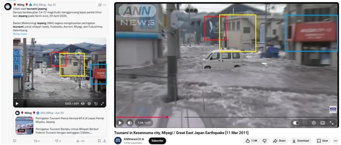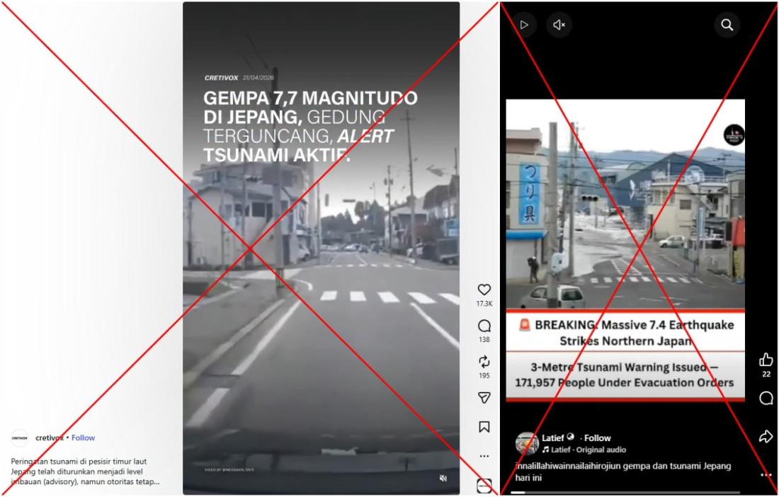Peringatan tsunami sempat dikeluarkan setelah gempa berkekuatan 7,7 magnitudo menerjang wilayah Jepang pada 20 April 2026. Beberapa jam setelah media mulai memberitakan fenomena alam tersebut, sejumlah akun media sosial mulai membagikan video lama dengan narasi salah terkait gempa terbaru di Jepang. Faktanya, video-video yang menyebar tersebut memperlihatkan tsunami di wilayah timur Jepang pada 2025; rekaman dampak gempa di wilayah barat Jepang saat Tahun Baru 2024; dan gempa serta tsunami dahsyat di tahun 2011.